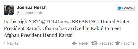 A journalist in Afghanistan reported having seen Air Force One and took to twitter. Soon, American journalists caught wind of this and started reporting of the unannounced visit. As Mashale noted, Josh Hirsch from Huffington Post was the first: