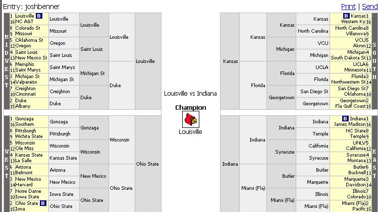 Unlike last year, I don’t feel that there is an obvious favorite to win the entire tournament. I’ll stick with Louisville.