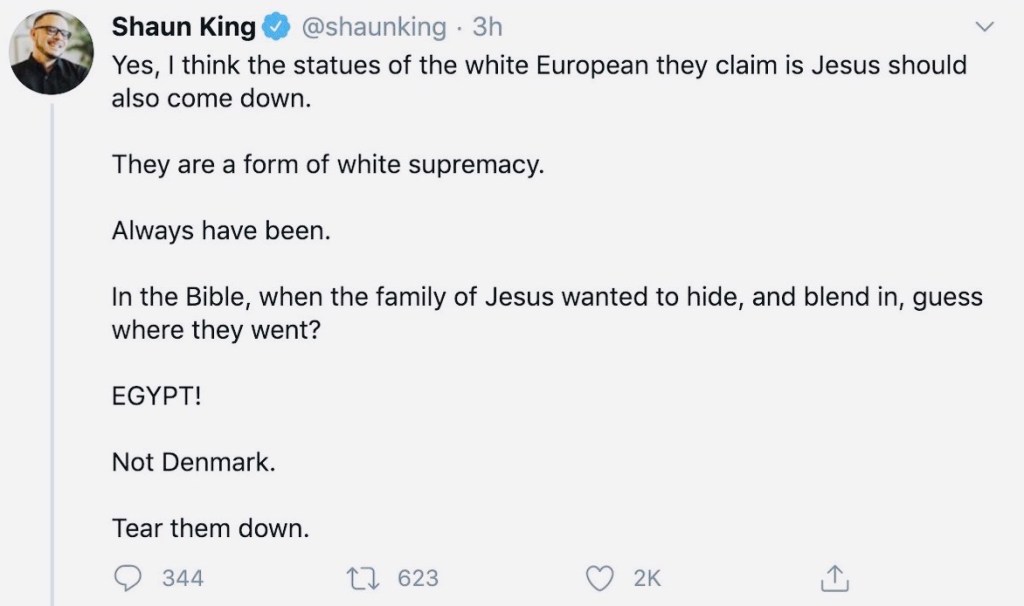 It was only a matter of time. Activist and writer Shaun King has taken aim at images and sculptures which depict Jesus as white.